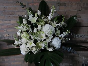 A Graceful Arrangement Of Elegant White Roses~Hydrangea~Snapdragons~Lilies & Wax Flower With A Hint Of Mini Green Hydrangea.