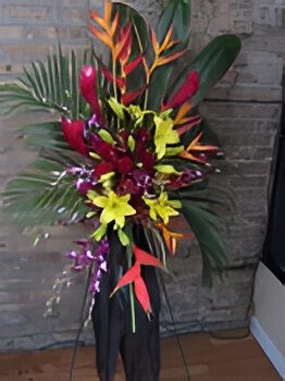 A Beautiful Mix Of Tropical Flowers~Lilies & Roses On A Standing Easel. Flower Selecton May Vary Due To Seasonal Availablility. This Arrangement Is Suitable For Male Or Female Memorial.